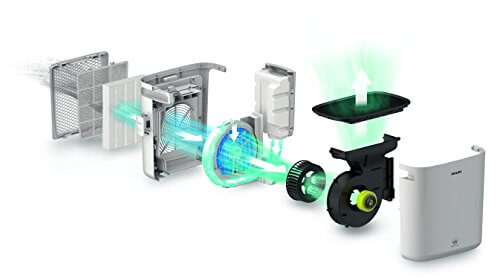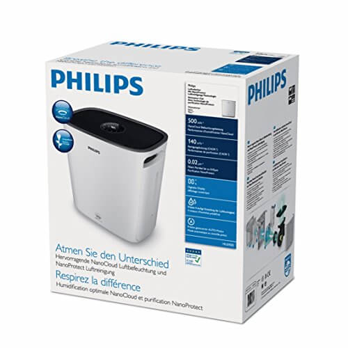 Der Philips HU5930/10 ist Luftwäscher und Luftreiniger zugleich. Diese besondere Kombination führt zu einer deutlichen Steigerung des Luftreinigungsergebnis. Der im Philips HU5930/10 eingesetzte HEPA-Filter filtert kleinste Partikel wie Staub, Pollen und Bakterien sowie Keime. Der Philips arbeitet im Bereich der Luftbefeuchtung nach dem äußerst energieeffizienten Verfahren der Kaltverdunstung. Damit sorgt der Philips HU5930/10 für eine optimale und gesunde Luftfeuchtigkeit. Hierbei ist eine Überfeuchtung der Raumluft durch die Steuerung per Automatikmodus ausgeschlossen. Ebenfalls regelt der Philips H5930/10 in Zusammenarbeit mit einem integrierten Hygrometer die Befeuchtungsintensität. Die Bedienung des Geräts erfolgt hierbei über ein übersichtliches Touchscreen Display, welches zusätzlich die Zimmertemperatur, einen Filterwechsel und die Luftfeuchtigkeit der Raumluft anzeigt. Das Bedienfeld kann sogar über eine Kindersicherung gesperrt werden. Eine Timerfunktion ermöglicht außerdem einen genau auf Ihre Bedürfnisse angepassten Gerätebetrieb. Die Reinigung des Philips HU5930/10 ist aufgrund des durchdachten Designs einfach und unkompliziert.